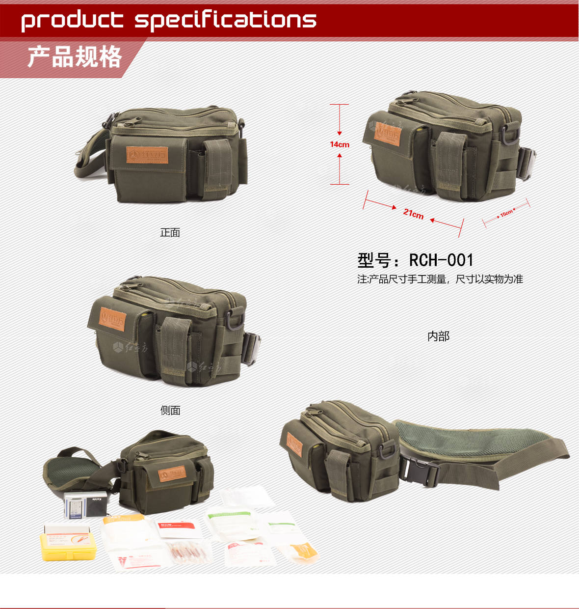 | 型號(hào):RCH-001戶外應(yīng)急包 | 外包材質(zhì):滌綸 | 顏色:軍綠 | ||||||